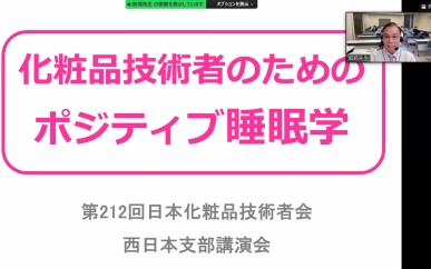 『化粧品技術者のためのポジティブ睡眠学』という演題で、医師でもある中部大学の宮崎総一郎先生の睡眠に関する講義を受講しました。講義はなんと7分間の「お昼寝」から始まりました。15時までに深すぎない短時間の昼寝を取り入れることで、午後の業務効率の向上に限らず、小学生では体調不良や怪我が少なくなるとのことでした。日本人は慢性的な睡眠不足による睡眠負債が大きく、諸外国と比べると睡眠負債による経済損失も認められるとのことでした。一方、睡眠不足を解消することで、生活習慣病の改善にも繋がるとのこと。私自身、20歳代の頃と比べると長く寝るようになったのですが、睡眠で疲れが取れていないと実感することがたびたびあります。講義で先生が紹介されていた「不眠度テスト」と「睡眠不足テスト」を行うと、睡眠不足であることがわかりました。