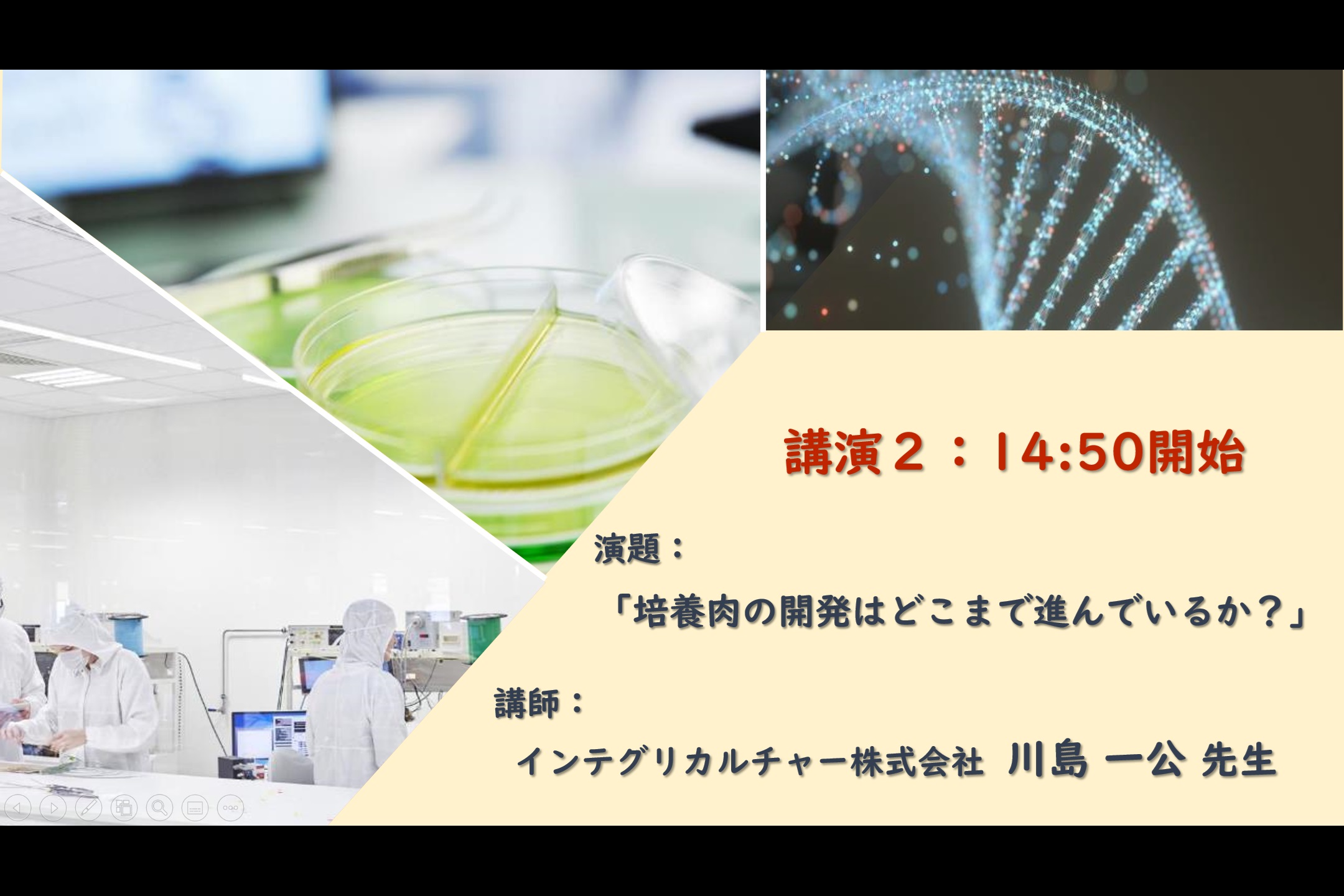 2題目は、インテグリカルチャー株式会社 川島一公先生から『培養肉の開発はどこまで進んでいるか?』と題して、タンパク質源の生産供給問題の解決策として注目されている培養肉について、作出方法の基礎的な知見、社会実装のための国内外の技術動向についてご講演いただきました。