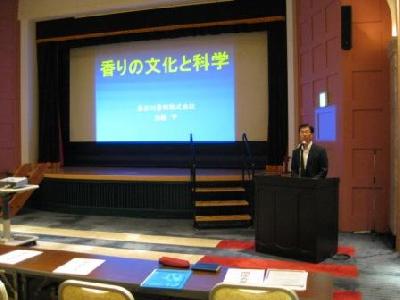 1題目は、長谷川香料(株)品質保証部の浅越亨氏より、『香りの文化と科学』という演題でご講演頂きました。ご講演の内容としては、匂い、香りのメカニズムから、香料に関する説明、香りの機能性、香りに関する西洋と東洋(日本)の違い、香料の安全性等、幅広い範囲でお話を頂きました。この中でも、西洋と東洋(日本)での習慣、文化の違いによる、香りの受け止め方の違いについては、大変興味深い内容であり、今後、日本企業が海外展開する場合に注意すべきポイントであると感じました。