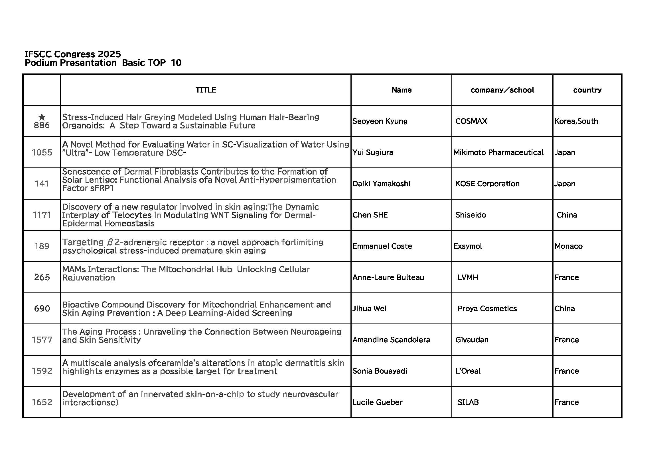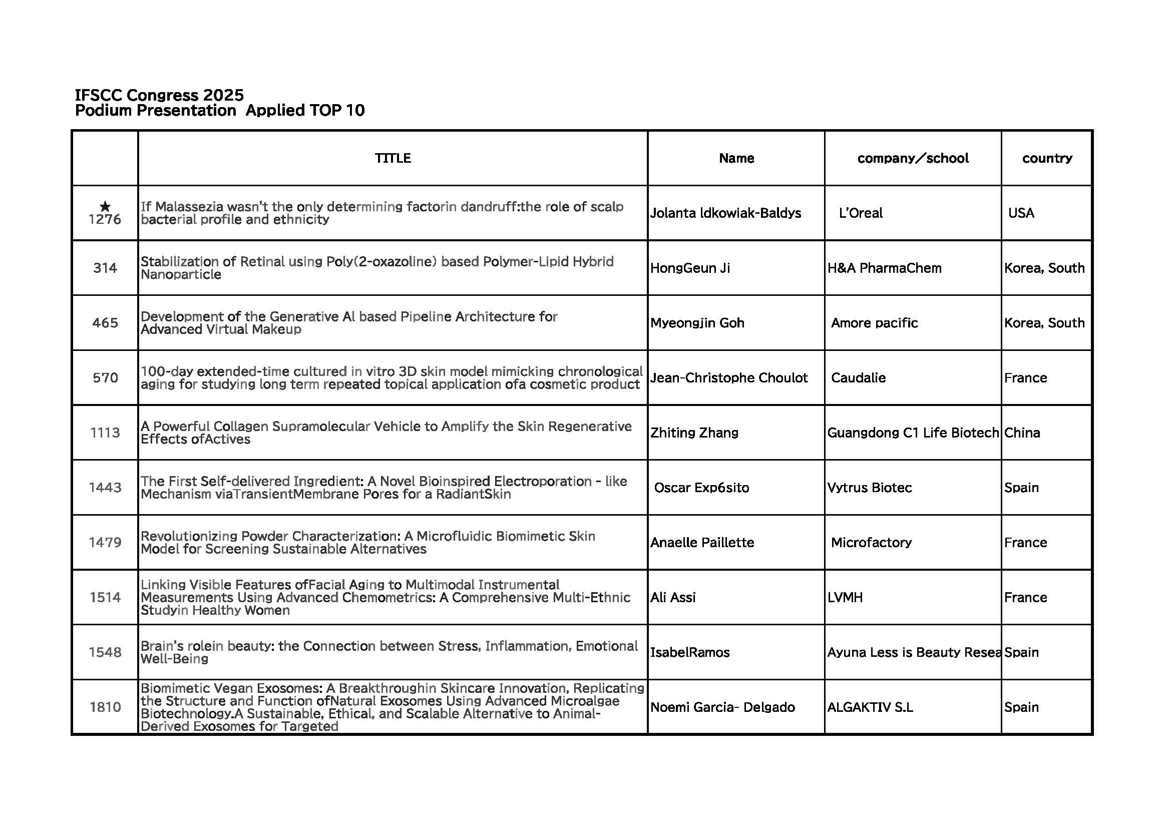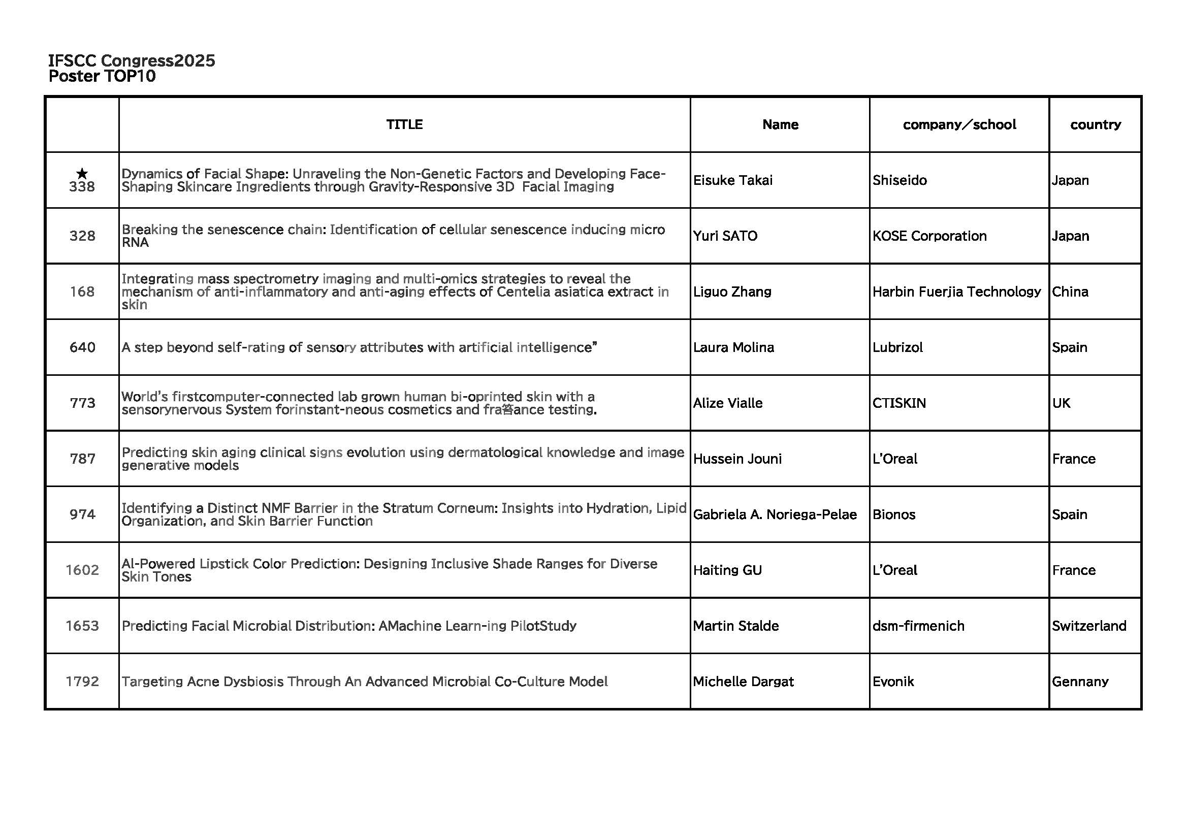 ★各Award TOP10詳細は <IFSCC Congress 2025 TOP10> をご確認ください。