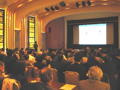 1題目は、(株)カネボウ化粧品 基盤技術研究所 主任研究員の佐用哲也氏より、『細胞の母体としてのヒアルロン酸』という演題でご講演頂きました。ご講演の内容としては、細胞老化の様々な研究のご紹介の後、ヒアルロン酸の三つの効果(細胞シールド、細胞の移動・増殖・分化、水分保持・弾力性)についての解説をして頂きました。そして、生体内でのヒアルロン酸の代謝制御の可能性についての研究知見をご紹介頂きました。化粧品において、ヒアルロン酸は保湿剤としては、極めてポピュラーな成分ですが、生体内で細胞の母体としての機能と代謝のメカニズムについては、まだまだ未知の部分が多く、化粧品だけでなく医薬の分野においても、非常に興味深い研究テーマであると感じました。